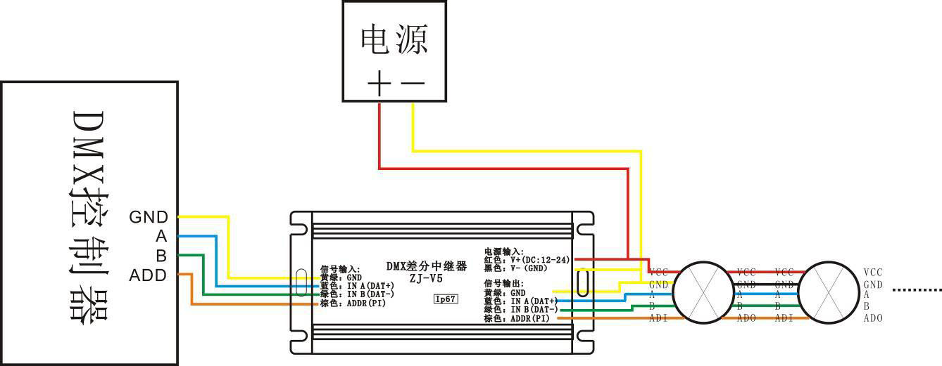 供电电压:DC12-24V 传输距离:增加一个“差分中继器”可以使信号的传输距离最多增加50米。 信号输入端:GND(地线) INA(信号输入端A) INB(信号输入端B) ADD(写址线) 信号输入端:GND(地线) INA(信号输入端A) INB(信号输入端B) ADD(写址线) 尺 寸:L125mm*W56mm*H35mm